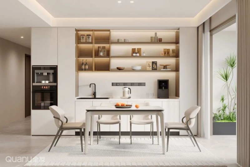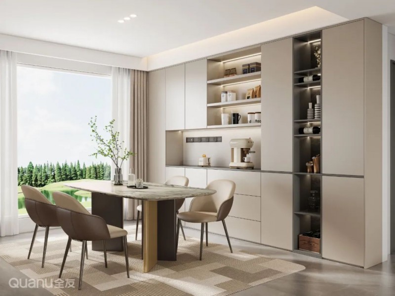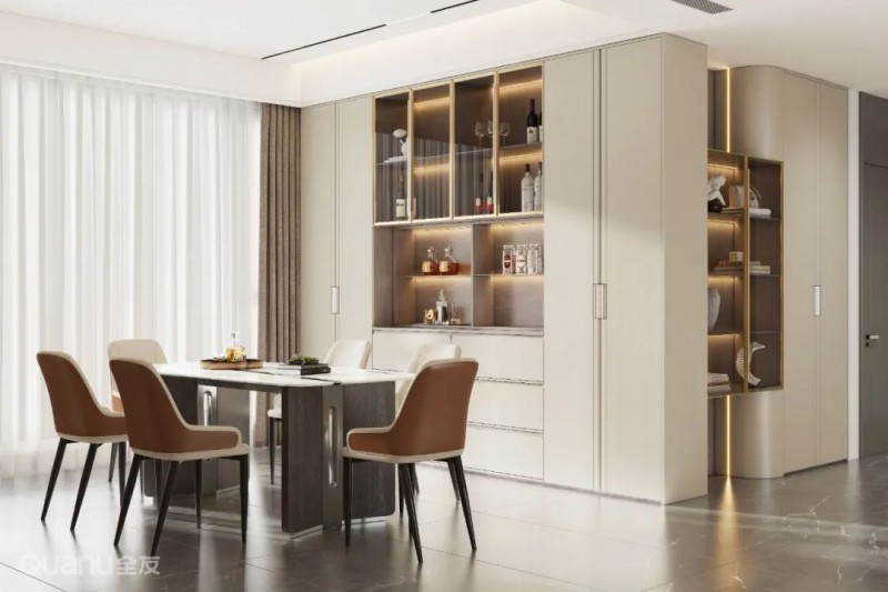①采用餐边柜+酒柜一体化设计,仅保留少量玻璃柜门展示常用酒类、酒具,能同时满足餐具、小家电及酒类酒具等收纳需求,提高空间利用率;
