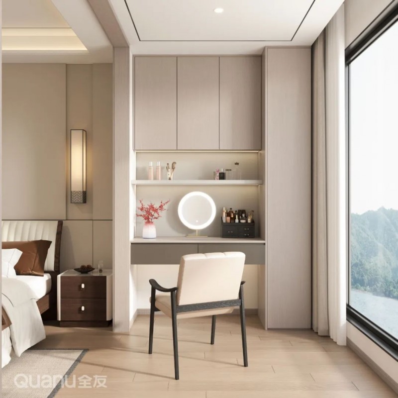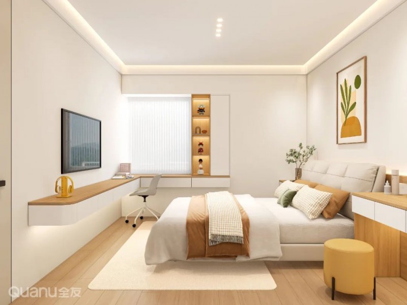②通过延伸、叠加等设计手法,连接飘窗定制立柜、书桌或梳妆台,强化卧室实用功能。