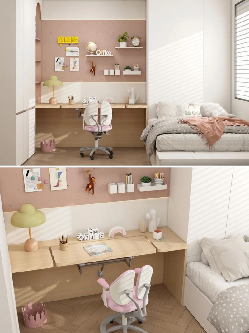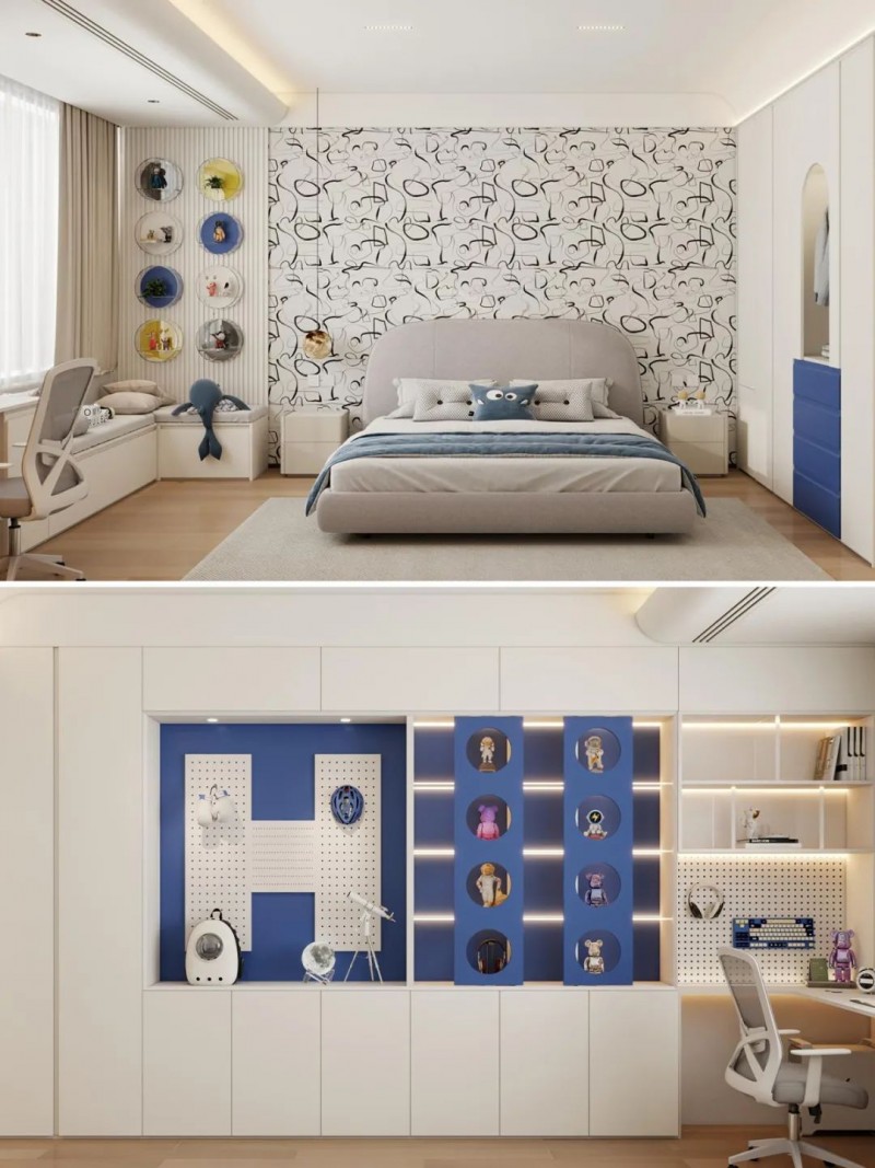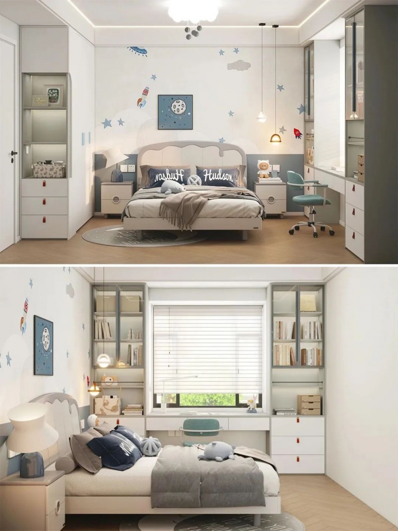 选择可调节高度的书桌、层板可灵活移动的衣柜,墙面使用磁吸板替代固定装饰。这些设计方便家长根据孩子年龄的增长,灵活调整空间的功能布局。