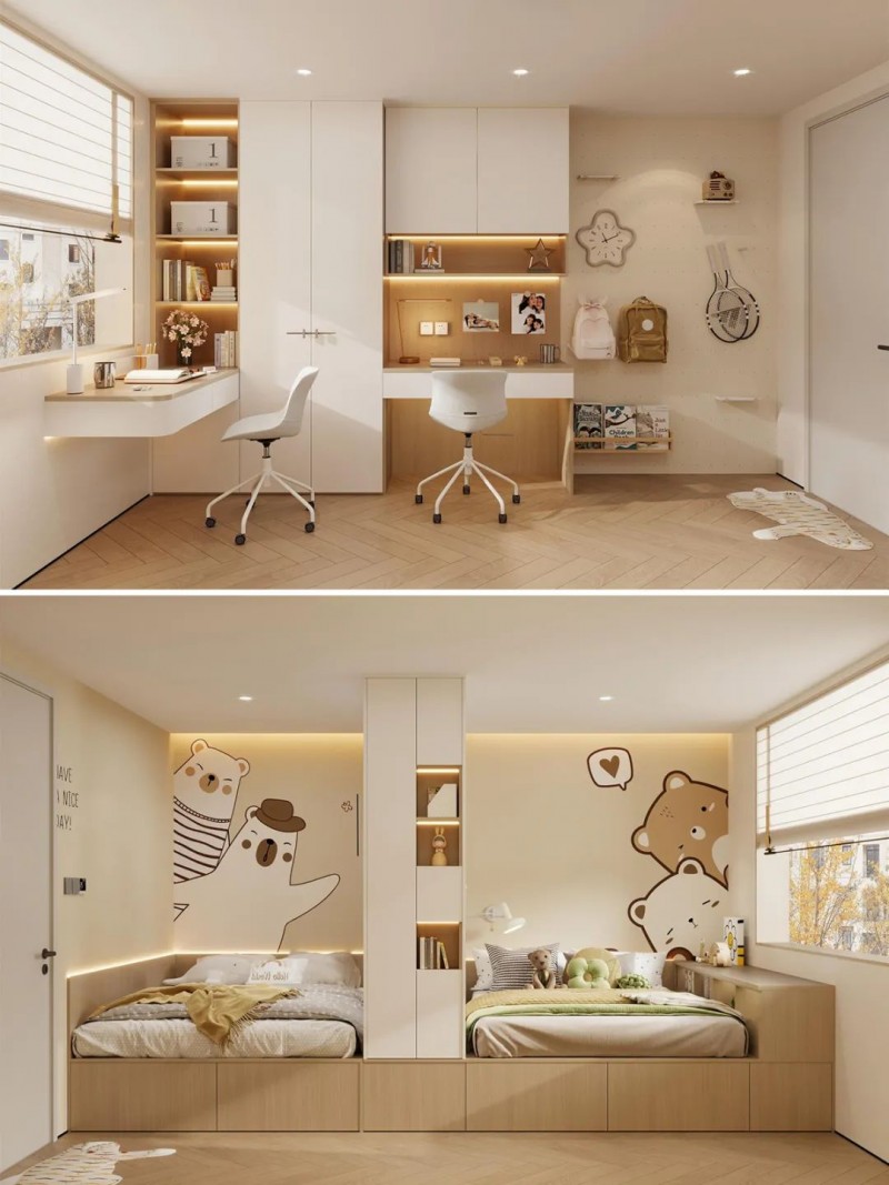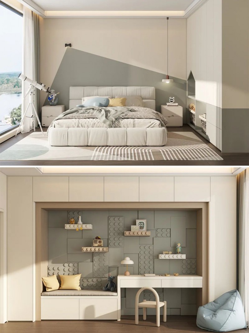 清晰划分学习、娱乐、休息区域,通过一体化设计与灵活的空间布局策略,高效满足孩子学习、玩耍、休息等多元化需求。