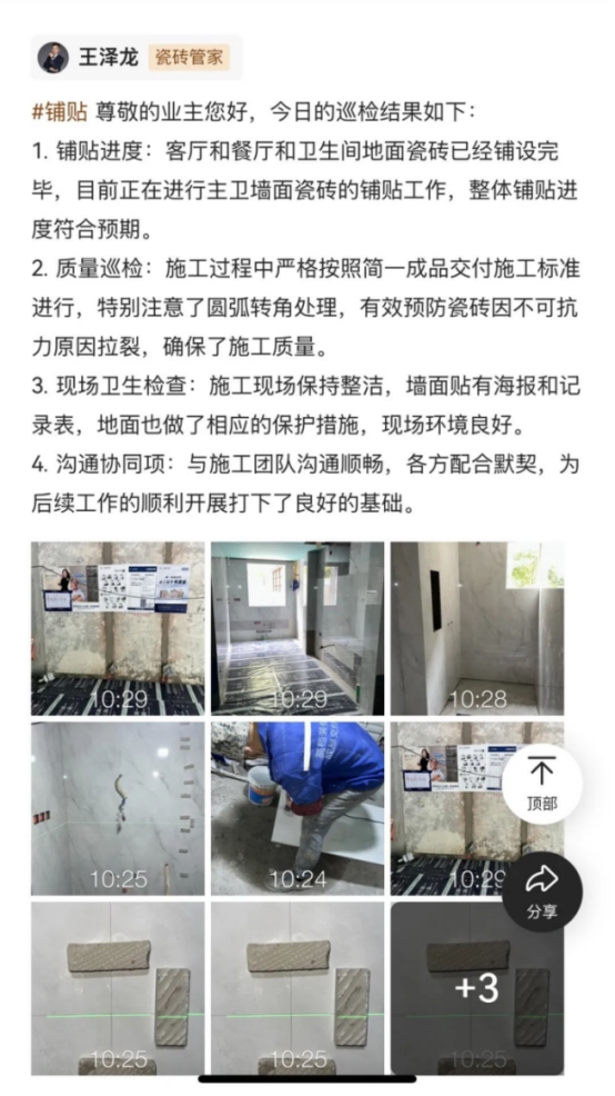 装修过程往往充满焦虑,但简一的共情式服务让这一切迎刃而解。简一制定了108项“显微镜级”的数字化品控标准,涵盖装修的每一个细微环节。同时,将整个装修过程划分为12个节点,实现全流程可视、可控、可追溯。业主只需通过手机,就能随时查看装修进度和安装效果。每天,业主还能收到瓷砖管家发送的详细“小作文”,汇报当日工作进展、遇到的问题及解决方案。这种透明化、人性化的服务模式,让业主仿佛在刷朋友圈一样轻松监工,将装修焦虑化为期待,真正体验到被贴心陪伴的安心。