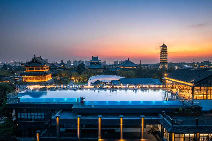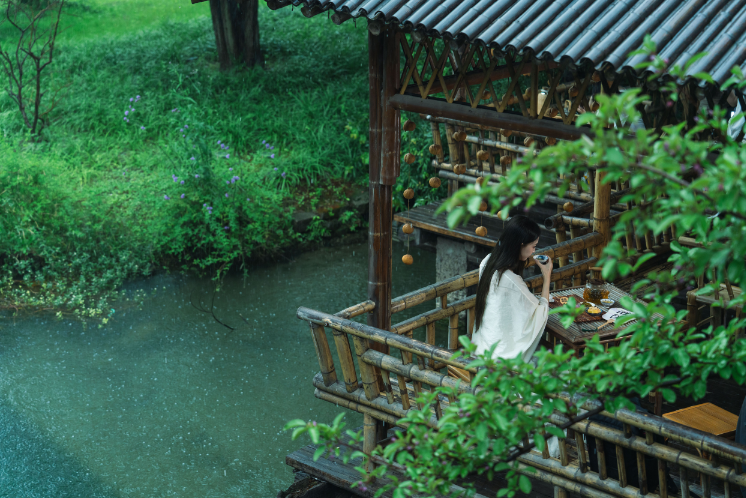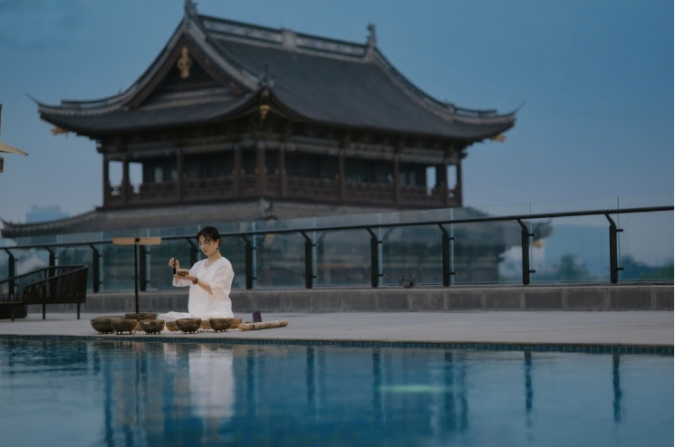 在梅尚度假酒店,无边泳池揽落日入怀,蔚蓝色的粼粼波光与千年古镇的飞檐翘角共绘一幅流动画卷,形成自带高级滤镜的“出片圣地”,带来视觉与社交的双重治愈。疗愈体验则向更深层次探索——水上颂钵、音疗晒背等创新项目,借水之柔、声之韵,引导游客卸下疲惫,在流动的能量场中寻回内在平衡。