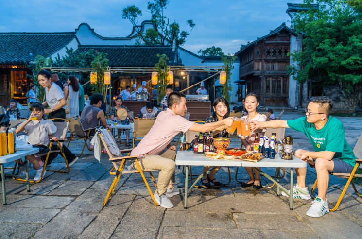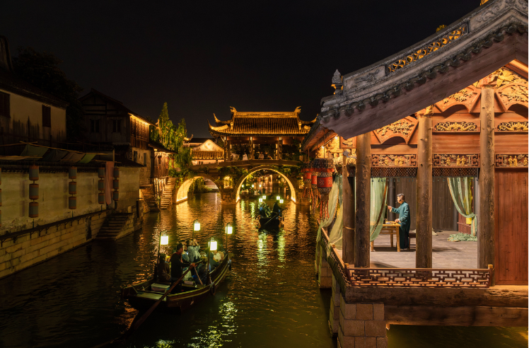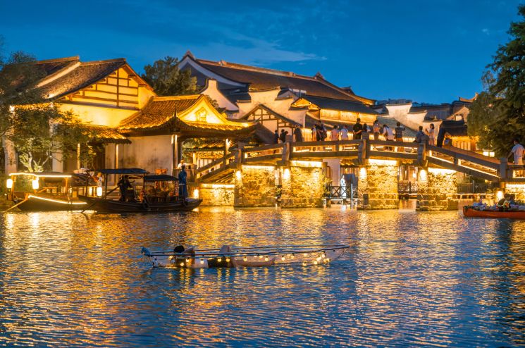 针对夜购、夜食、夜秀、夜娱、夜游、夜运动等个性化、年轻化需求,景区的璀璨“夜态”更唤醒江南古镇的“多巴胺”。“躺平夜划”项目深受大学生群体热捧——以灯光点缀船体,于“蓝调时刻”仰卧观景,这种从内到外的放松体验,与当代年轻人“反卷”的生活态度高度契合。