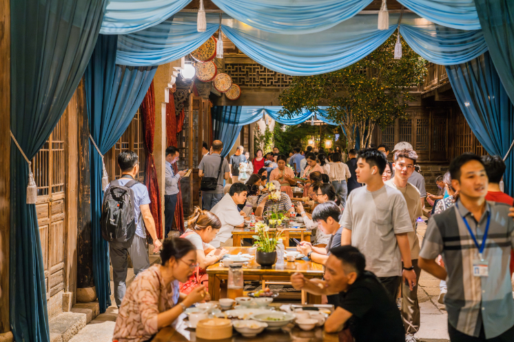 夜间餐饮场景则与在地文化深度联结——北廊棚广场和深夜食堂的“乘凉夜饭”结合露天电影与轻餐饮,强化好友社交场景;寺湾街“纳凉夜市”现宋韵集市风貌,以 “一街一巷皆场景,一铺一摊皆故事” 的理念,融合街景演绎、NPC互动等,再现《梦华录》中的繁华盛景。除此之外,景区内的瓦舍说书更以“吃瓜大会”等互动形式活化传统文化,共同构成“可参与、可记忆”的夜间生活矩阵。
